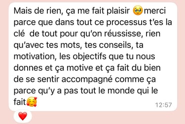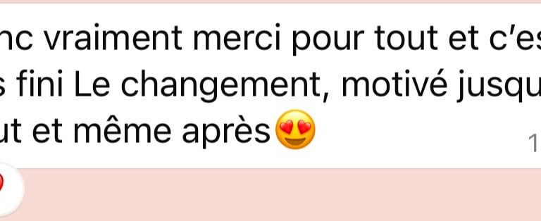 Autant pour le côté mindset que nutrition, je serais disponible 7j/7 (sur WhatsApp) pour échanger quotidiennement avec toi, répondre à toutes tes interrogations, afin que tu aies le plus d’informations possibles sans attendre. Plus d’excuse pour ne pas être motivée, je serais constamment là pour te rebooster !
